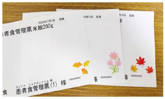 それ以外でも、入院中は季節の変化を体感しにくいため、月の上下旬に1回は、季節の花等を印刷した用紙に食事のネームカード(食札)を印刷しています。(写真2)