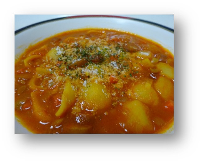 1.野菜ジュースで作ったミネストローネ 2.非常食用レトルトカレーをアレンジ