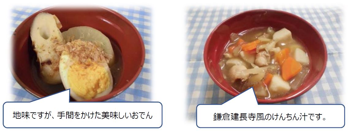 大層な料理ではありませんが、例えば「おでん」は、少量ではありますが、お出汁のかおりが立つように、丁寧にとった天然だしから煮込み、盛り付け時にはそれぞれのお椀に鰹節を盛り付ける、けんちん汁は、けんちん汁発祥と言われている鎌倉・建長寺の作り方を参考に調理するなど、毎食は困難ですが1食だけ、こだわった食材と調理、盛り付けを行い提供させて頂いています。(写真1参照)