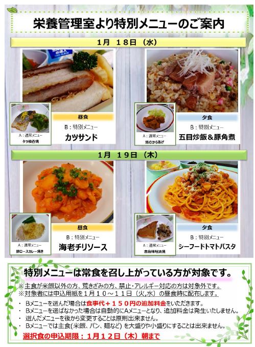 そこで、特に食事の制限がない方々にはなってしまいますが、食事を楽しんでいただけるように始める「特別メニュー」です。