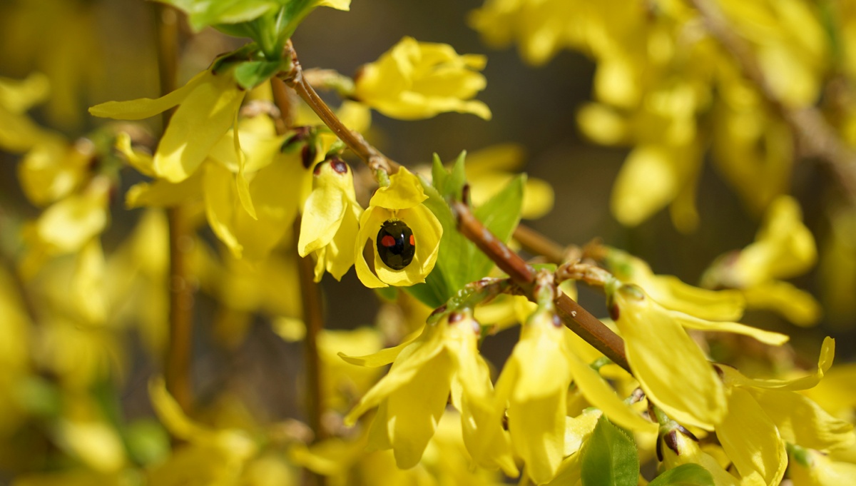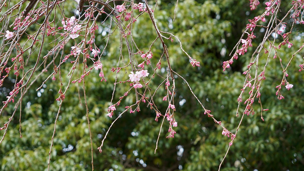 枝垂桜 三分咲き / レンギョウとテントウムシ