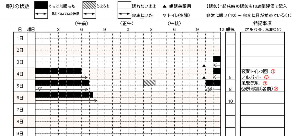 これから初診を予定している方は、記録済の睡眠日誌を持参して初診に臨むと診察が円滑になるでしょう。