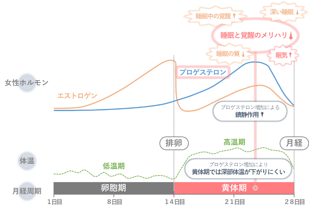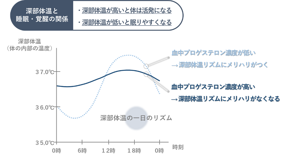 女性ホルモンとは、妊娠・出産など女性特有の機能を整えるホルモンの総称です。代表的な女性ホルモンに、妊娠の維持の役割を担うプロゲステロンと妊娠の準備の役割を担うエストロゲンがあります。それぞれのホルモン作用の中で、特に睡眠と関係の深いものとして、プロゲステロンの体温上昇作用、鎮静作用と呼吸促進作用、エストロゲンの覚醒作用が挙げられます。なお、プロゲステロンの体温上昇作用は、次のようなメカニズムで睡眠に影響するといわれています。体の内部の温度である深部体温は、睡眠と深く関係しています。深部体温が高いと体は活発になり、逆に低いと眠りやすくなることが知られています。一般的に、深部体温は朝方が最も低く、活発になる時間帯と関連して上昇し、休息を必要とする夜間に低下するというリズムがあります。体温上昇作用のあるプロゲステロンの血中濃度が高いと深部体温の低下が起こりにくくなり、深部体温リズムのメリハリがつきにくくなると考えらえています。すなわち、血中プロゲステロン濃度が高くなる時期は、深部体温リズムの変化を介して睡眠と覚醒のメリハリがつきにくくなると考えられています(図1)。