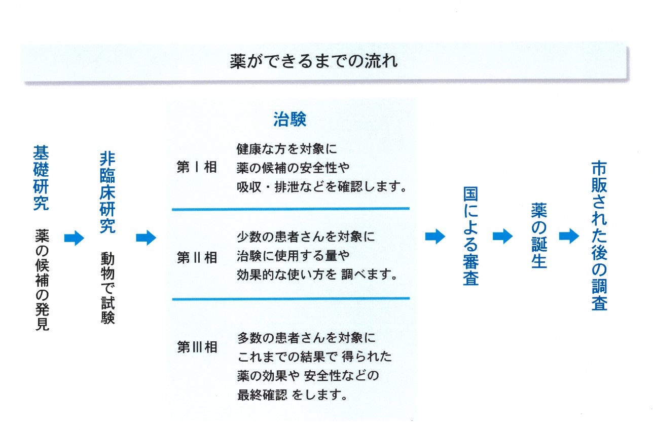 治験とは「薬の候補」を薬として認めてもらうために患者さんにご協力頂いて、「薬の候補」の効果と安全性を調べる試験のことです。