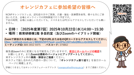 2025年10月22日(水)14:00〜15:30に開催されるNCNPオレンジカフェは、会場とオンラインでの同時開催で行う予定です。