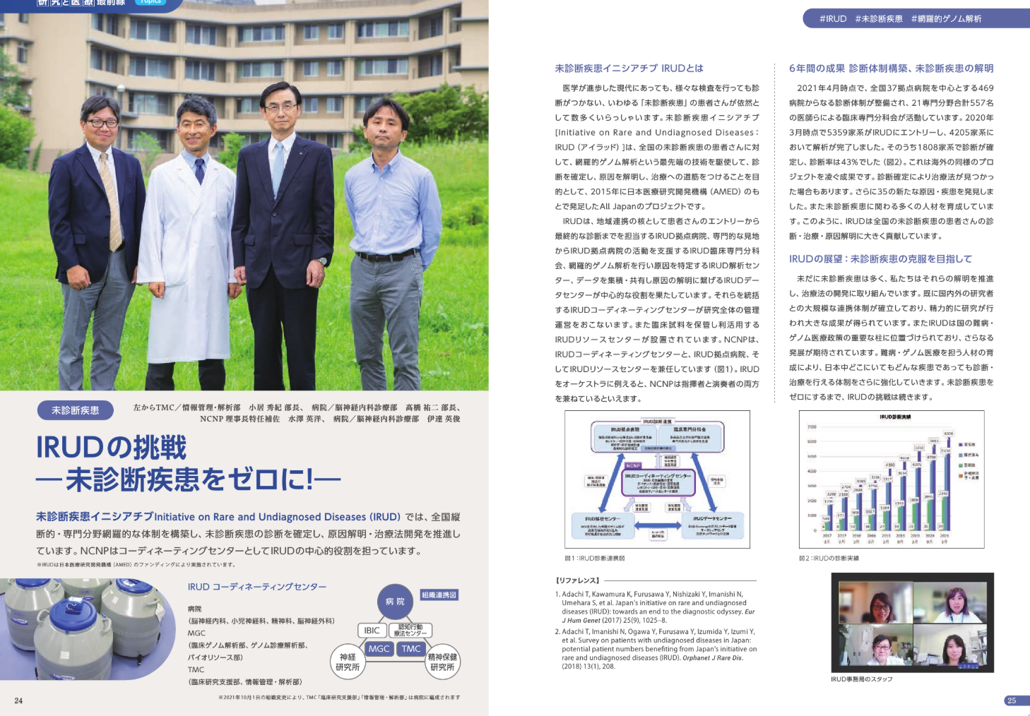 未診断疾患イニシアチブ(Initiative on Rare and Undiagnosed Diseases: IRUD)は、複数の臓器にわたって障害がある状態が長期に持続し、遺伝性疾患が疑われる未診断疾患の患者さんに対して、最先端のゲノム解析技術を駆使して診断を確定し原因を解明するための、全国縦断的・専門分野横断的なプロジェクトです。2015年に国立研究開発法人日本医療研究開発機構(Japan Agency for Medical Research and Development:AMED)を中心に小児IRUD、ついで成人IRUDが発足し、2017年に統合されました。