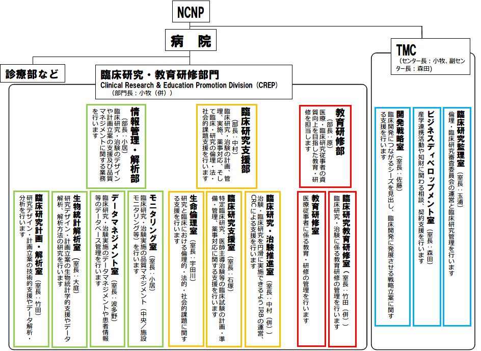 具体的な改編内容については図を参照いただければと思いますが、TMC情報管理・解析部と臨床研究支援部の大半が病院臨床研究・教育研修部門に移動、病院臨床研究推進部がなくなりました。結果としてTMCは3室のみの体制となり研究管理、産学連携支援、橋渡し研究支援などを担います。他の大学やNCと比較してNCNPの研究支援組織は決して大きいものではありませんが、様々な経験や知識を有するメンバーがそろっており、それなりのレベルでの研究支援が可能と考えています。NCNPが主導する医師主導治験については原則フルサポートしますし、臨床研究法下で実施する特定臨床研究や、薬事制度下での利活用に資するレジストリ構築に関わる主たる研究についても準備段階を中心とした部分的な支援になると思いますが、研究者の支援を今後とも積極的に進めていく所存です。今年度設置された教育研修部も病院臨床研究・教育研修部門の中に設置されることになりました。診療、ならびに臨床研究の質の向上には教育研修が重要であることは言うまでもないことで、教育研修機能の充実も今後検討していきます。
